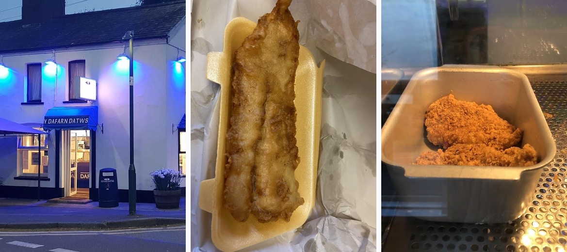 Y Dafarn Datws specializes in high-quality cod, providing a classic fish and chips experience. Other options include fishcakes and scampi, ensuring variety for all seafood lovers.